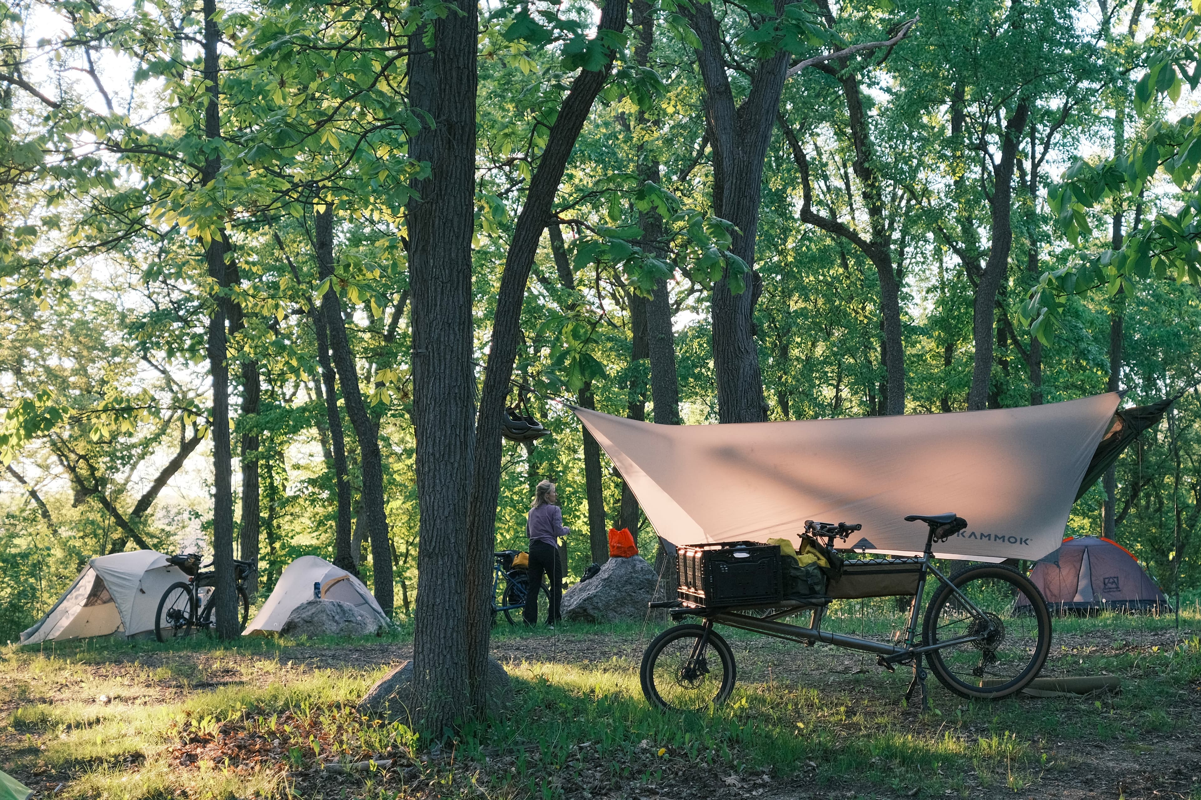 The first obvious challenge I faced when beginning was the size of my Omnium cargo bike. The places I like to camp often require singletrack, so the added length of the bike makes maneuvering tricky sometimes, though not impossible or bad enough to stop having fun. Overloading is easy to do, but one of the biggest benefits is not having to worry about what bag goes where. A couple of dry bags and a few old inner tubes to hold my gear on the rack, and I’m ready. The bike itself serves as a table or chair at camp! I bought a titanium Omnium frame and then pieced together the drivetrain, built the wheels (with a Dynamo hub], and a custom Rockgeist frame bag. I think with a long-term cargo bike, it's worth putting in the money to ride the exact bike you want.